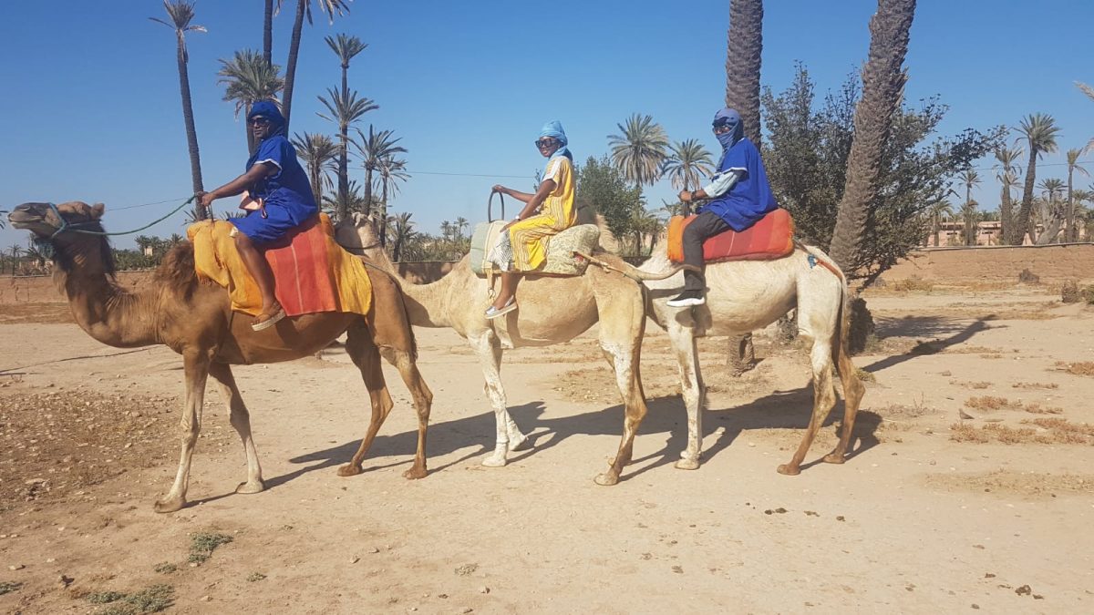 La Palmeraie est un vaste terrain planté de palmiers, situé en périphérie de la ville. Elle permet à tout un chacun, touristes ou locaux, de venir goûter à l’expérience de la traversée du désert à dos de chameau. Depuis la préparation de notre voyage, c’était l’une des expériences “à faire” de notre liste. Nous avons voyagé pendant une soixantaine de minutes à dos de chameau, comme des aventuriers en quête d’un rare trésor. Pendant tout le trajet, le guide nous conte histoires et légendes qui ont nourri l’imaginaire marocain.